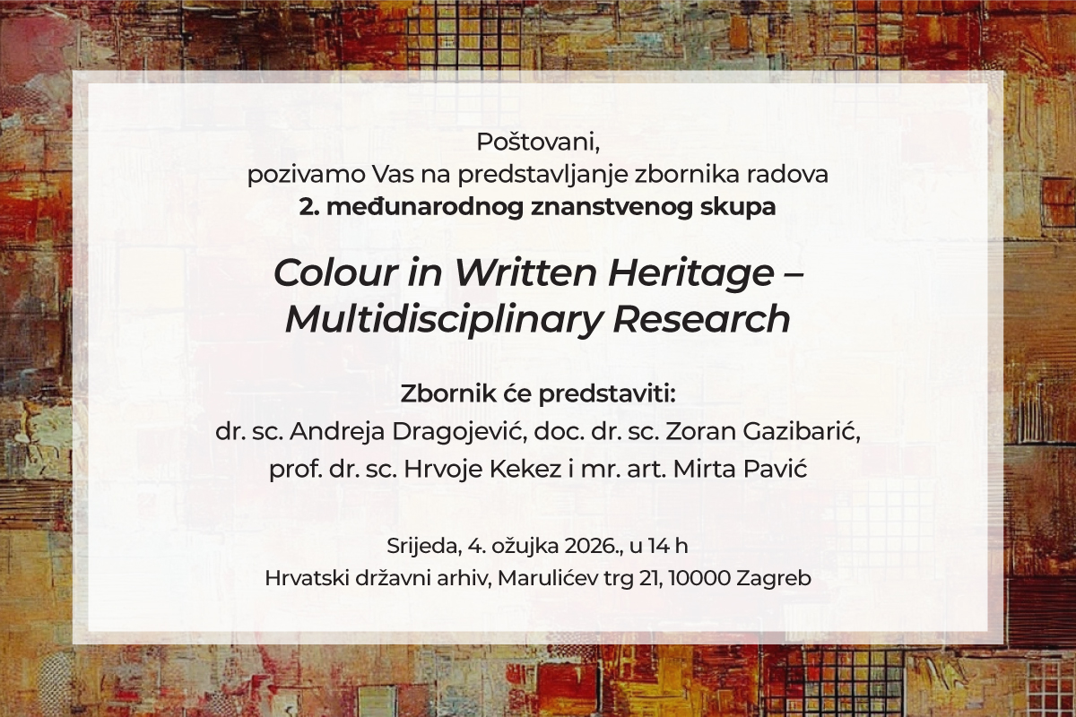 pozivamo Vas na predstavljanje zbornika radova 2. međunarodnog znanstvenog skupa Colour in Written Heritage – Multidisciplinary Research , 4. ožujka 2026., u 14 sati u Hrvatskom državnom arhivu.