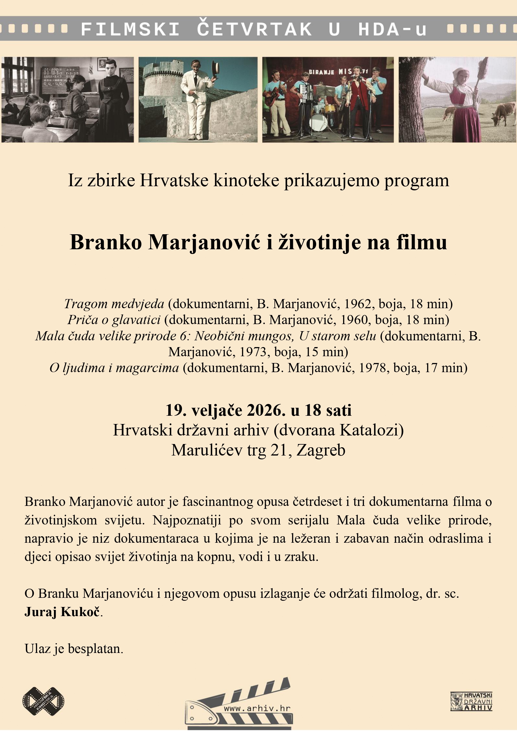 Filmski četvrtak u HDA-u pokrenut je 2013. godine radi popularizacije i promocije filmskoga arhivskog gradiva koje je pohranjeno u Hrvatskome filmskom arhivu. Filmske projekcije u okviru programa Filmskoga četvrtka održavaju se jednom mjesečno.